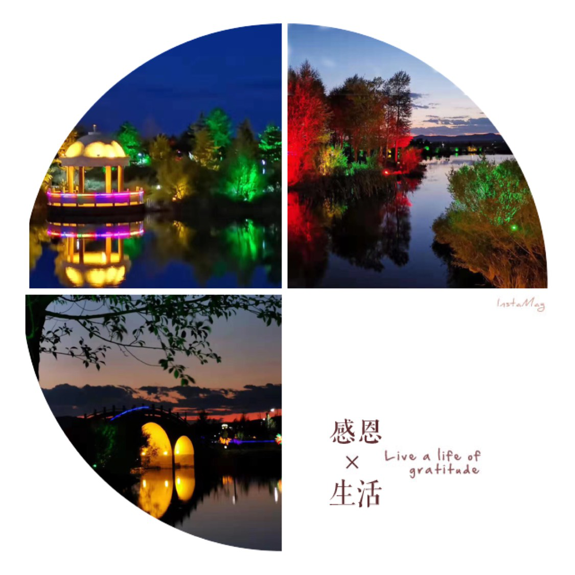晚上的濕地公園,同白天的大草原是截然不同的風景,夕陽落下,平靜的水面上亮起盞盞彩燈,這是在內陸的大都市不曾看過的景色。